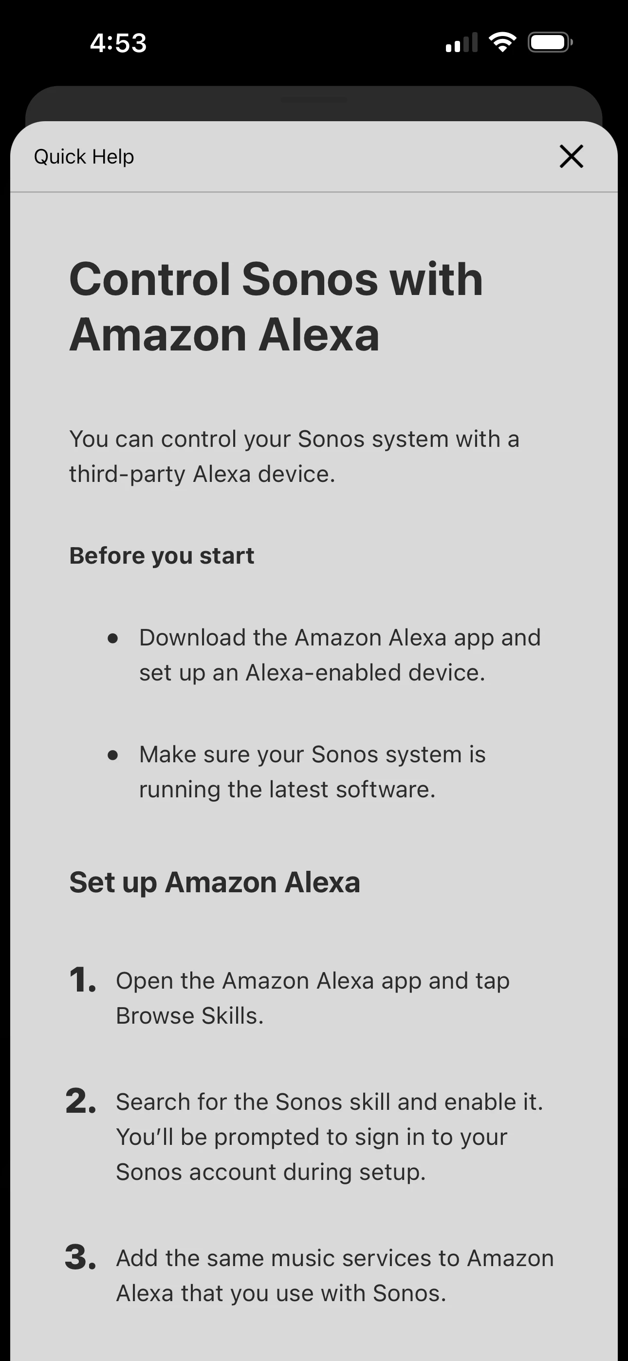 I followed the below directions but the first issue that I am having is in the Sonos App after I removed “Amazon Alex” in the “Voice Assistant” and tried to re-add it I get a new window that pops up, “Control Sonos with Amazon Alexa.” I followed the directions in the article, “Set up Amazon Alexa with a voice-enabled Sonos speaker.” But the problem is that after I click on Voice Assistants and then choose Amazon Alexa. It does not give me an option to choose my Sonos Arc and instead a quick help box shows up, “Control Sonos with Amazon Alexa.” I have provided a screenshot for reference.