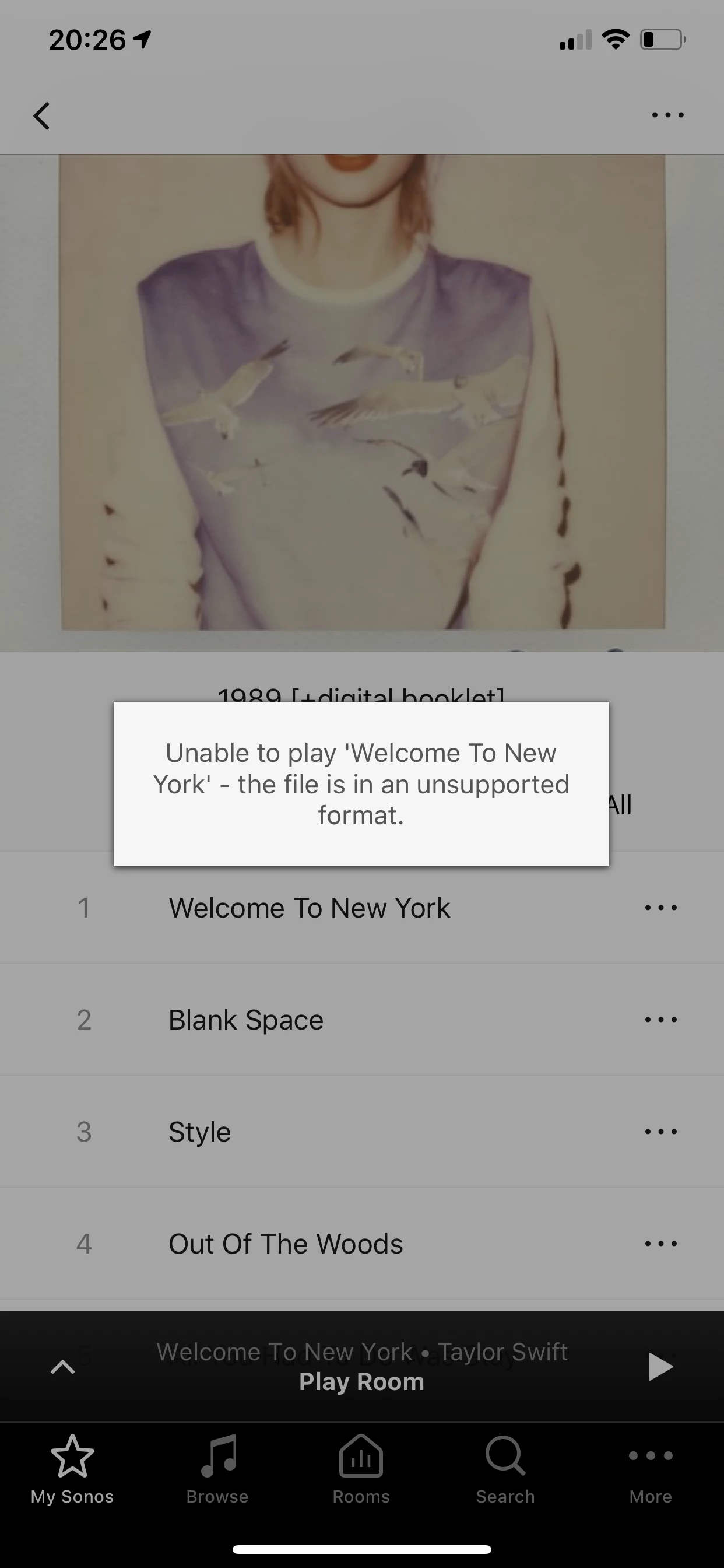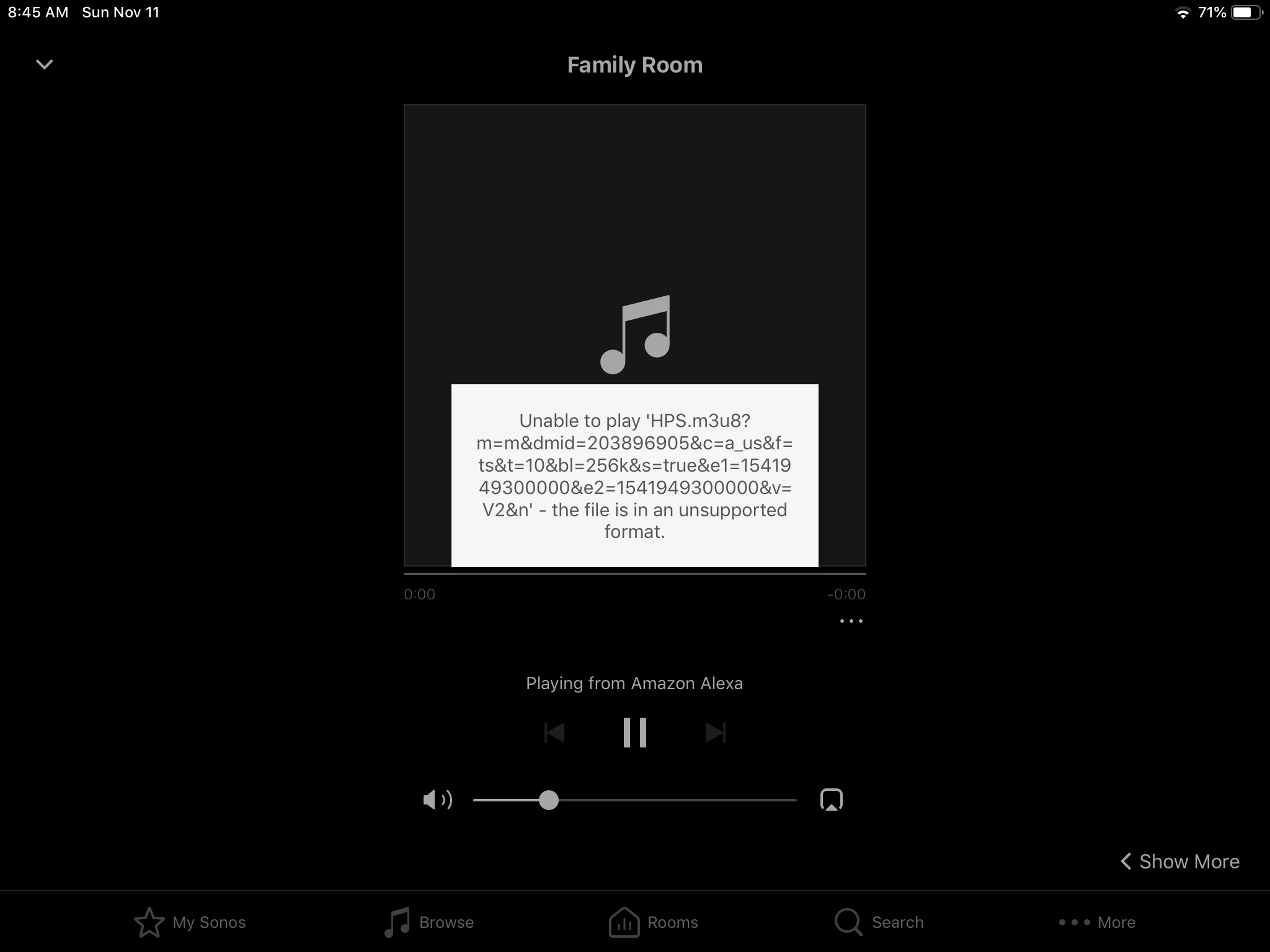My wife tried to play the Man from Uncle Soundtrack via Echo integration with Sonos. It appears to have kicked off correctly since when I go into the Sonos app it pops up the the message that is attached.