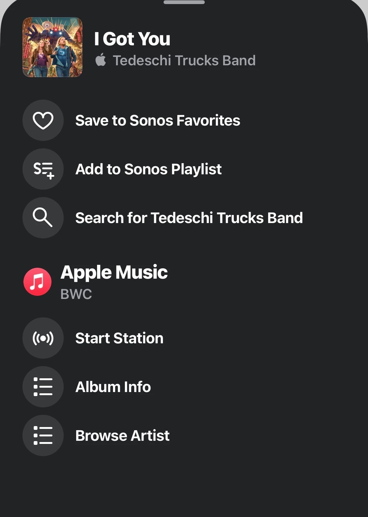 This happens on both my Android and iOS devices. Interestingly there's an app called sonify which is a free download and always works correctly. The Sonos app only work consistently for YouTube and Spotify but pretty much consistently fails to show view artist, view album, and start radio for Apple music. I can sometimes see those options flash for a fraction of a second before they disappear. Based on this behavior I believe it is a bug affecting only Apple music, at least for me anyway.