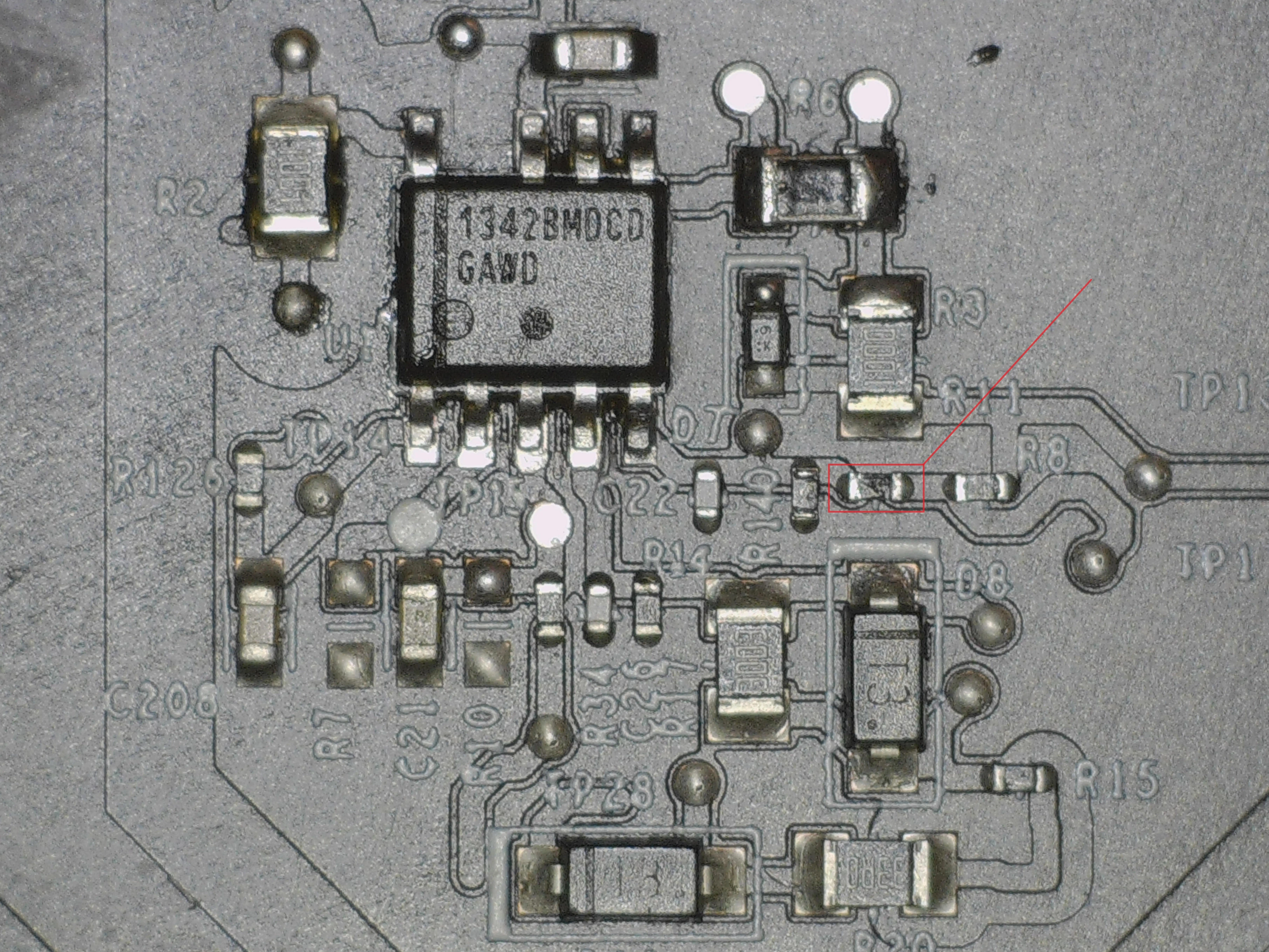 Replaced the resistor in the yellow box – that one was readable at 24.9 Ω and had a burn mark.