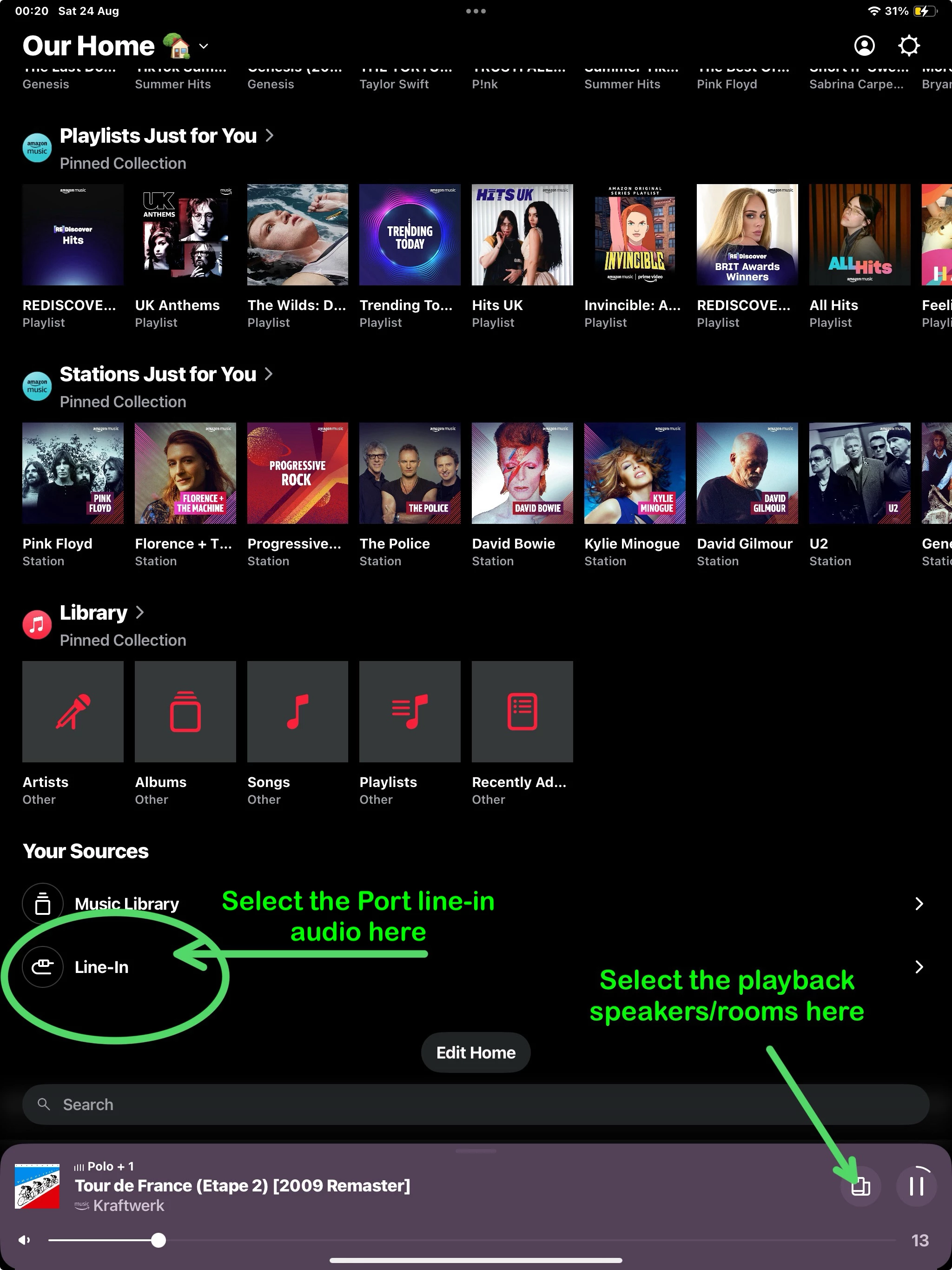 Instead, choose the Port’s Line In from the Home Screen, when the other room(s) are selected in the app.