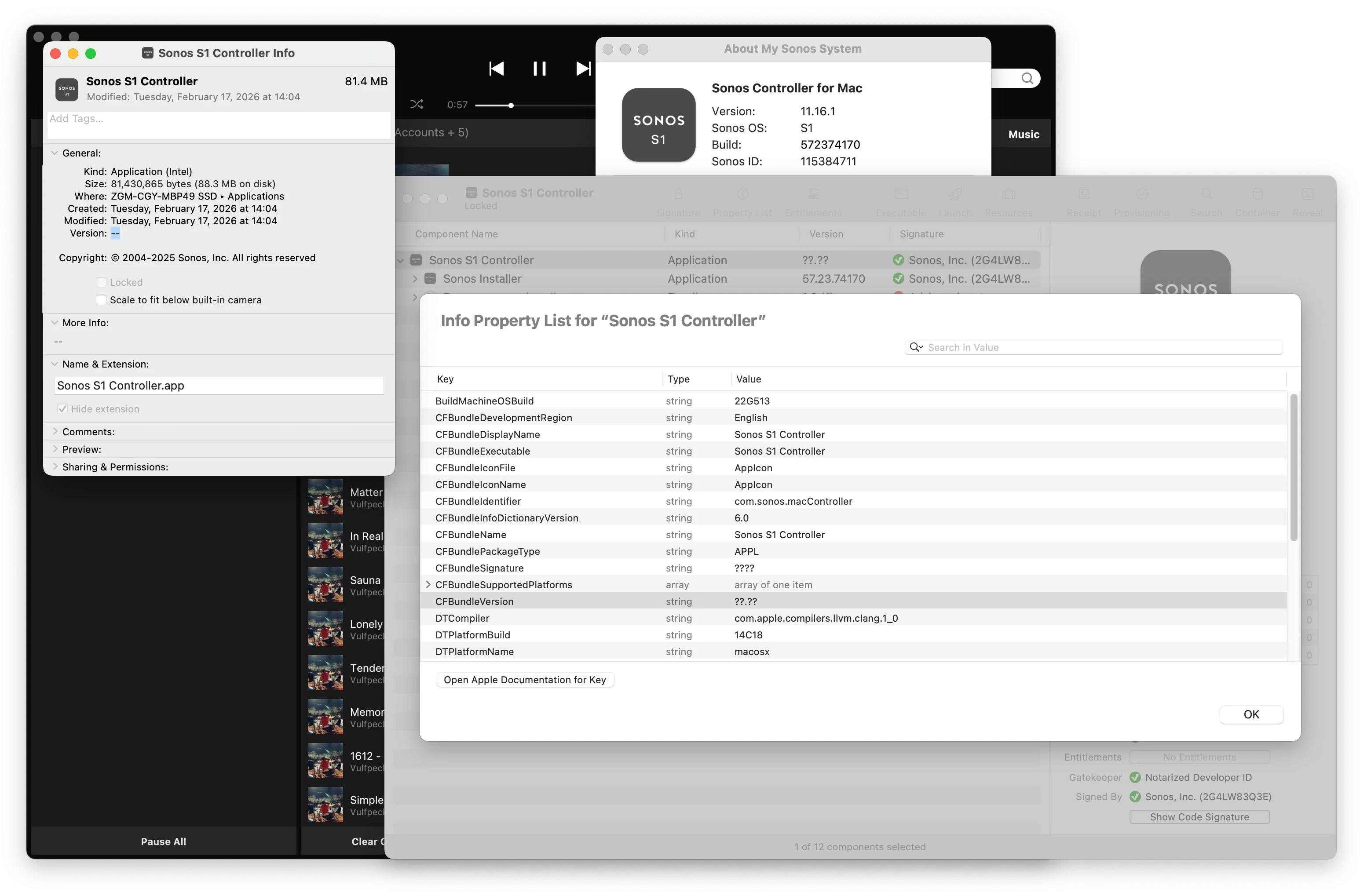 When running, the app itself reports multiple types of versions within the “About My Sonos System” window, however none of those have any bearing on what the software reports in macOS itself and thus, more critically, to any patching or management systems attempting to report on/update the software installed on macOS systems.