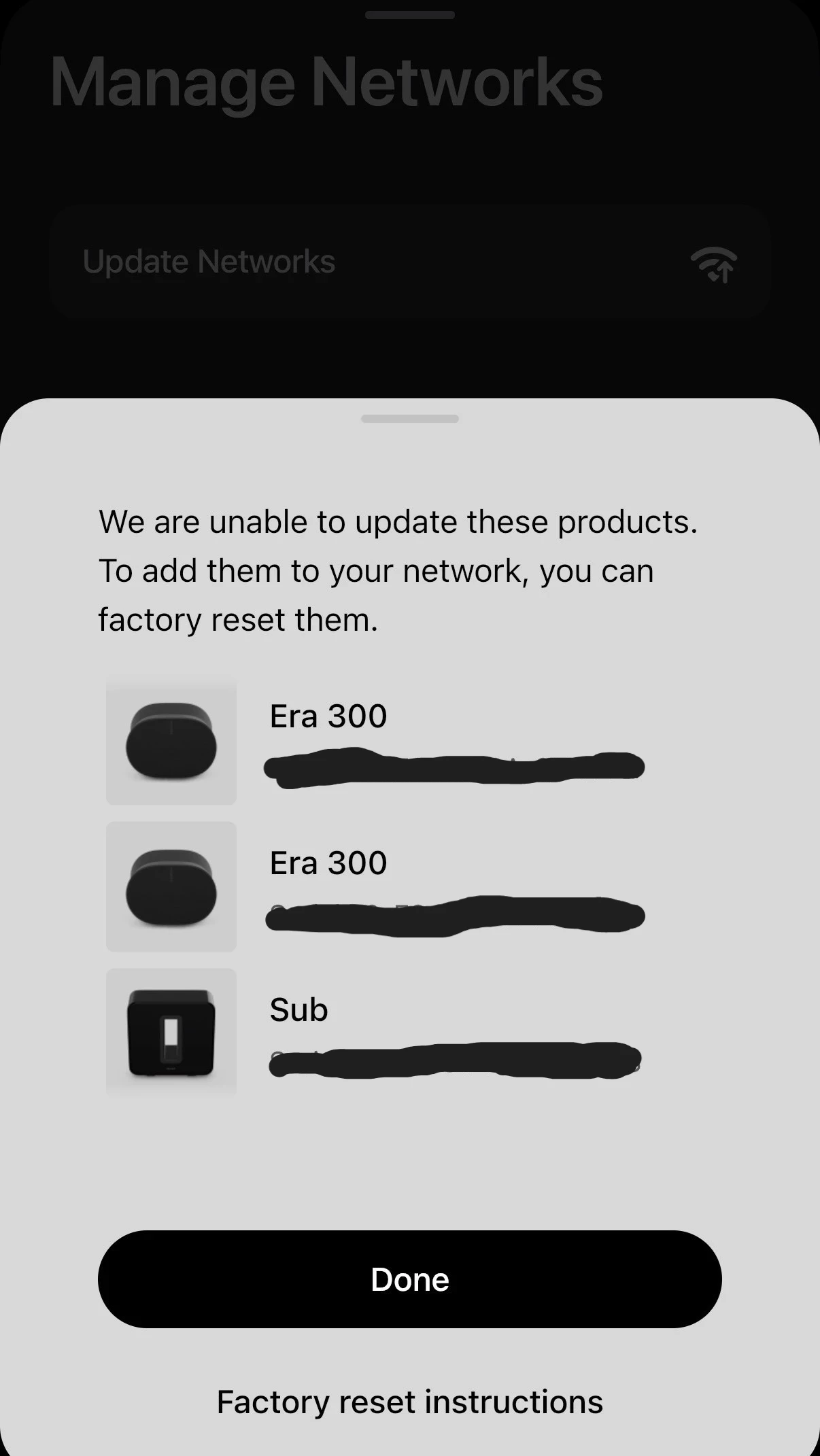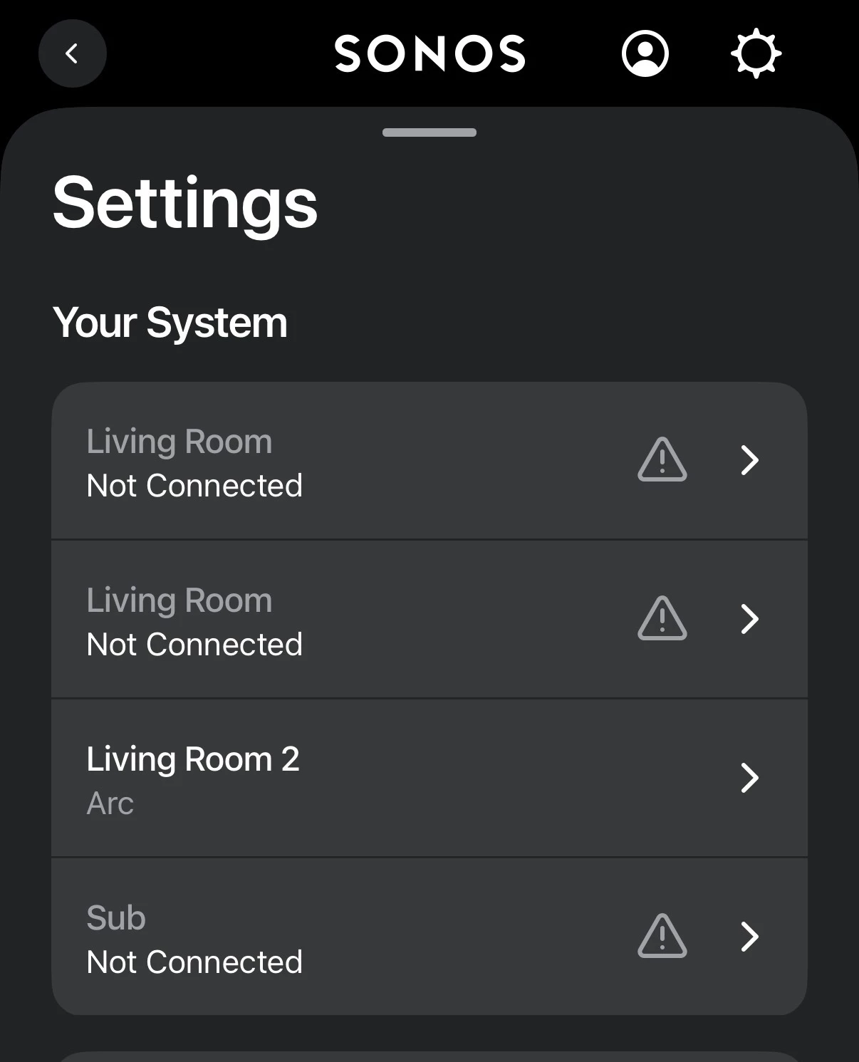 my system was working properly for long time but totally disconnected recently. So i tried to set up new system and reset all devices but still cant build new system despite that sonos app confirmed every new connected device. Previously i saw all devices connected and i could build theathre set up for tv but now i cant even see all devices…