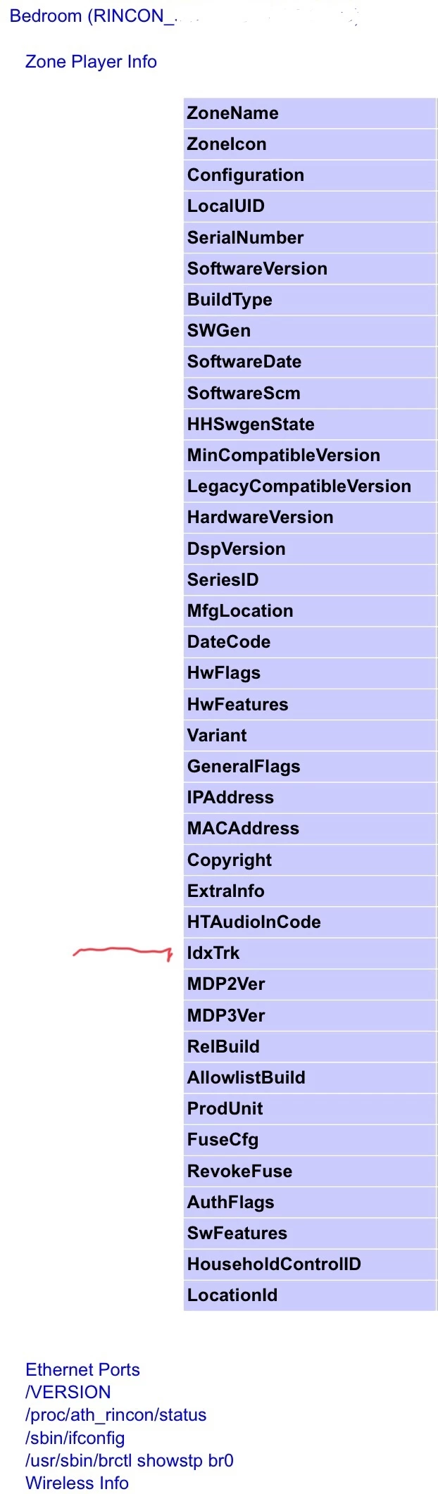 For the idxtrx you were referring to, is it found when I go to that http://ipaddress.. link you mentioned earlier? When I do that, I get a list of all my speakers that are online, and can click on each entry to expand for more info, but none of them have anything pertaining to idtrx. The list beneath each speaker is identical, actually, and no reference to idtrx.