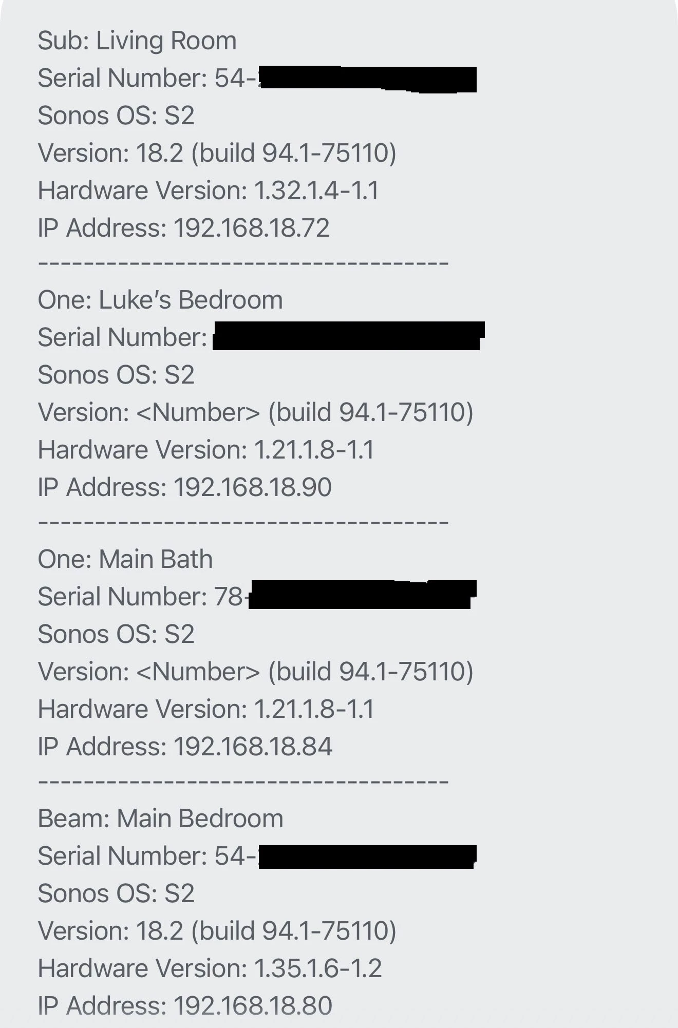 When using the About My System functionality in the Sonos App, some speakers have “<Number>” instead of the correct version next to them. The build number is always displayed correctly.
