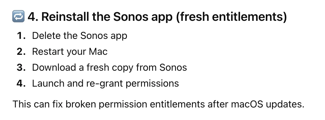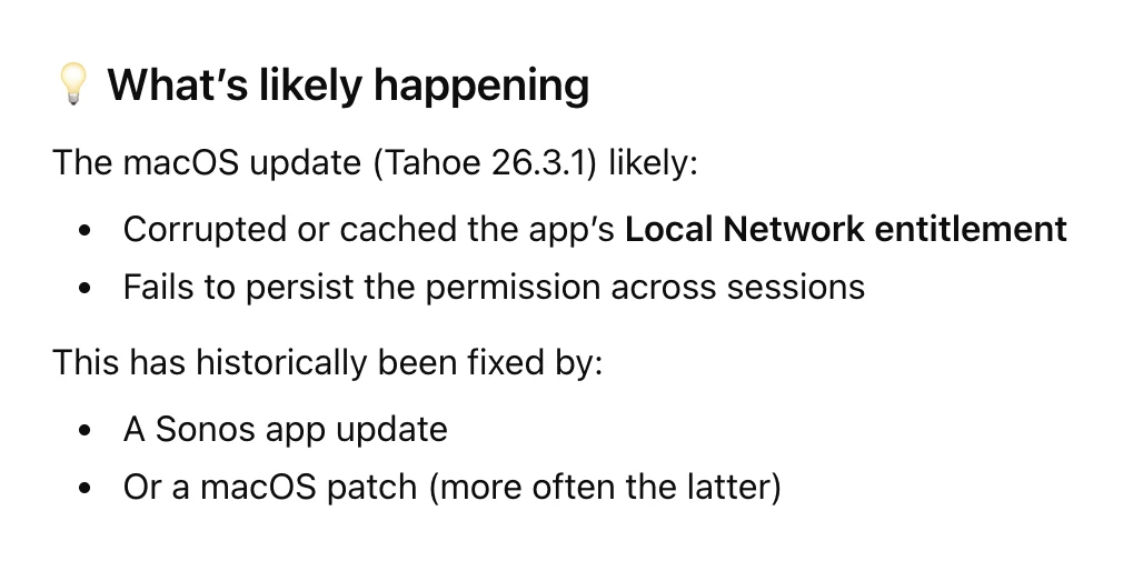 Since updating my Macbook Air to Tahoe [now at 26.3.1] the SONOS app fails to find SONOS on my local network until i open System Setting>Privacy & Security>Local Network and then turn the SONOS app setting off and back on. This situation as occurred in with past updates and was eventually patched, but this time it seems to be taking a long time. Any suggestions for something I’m missing on my end?