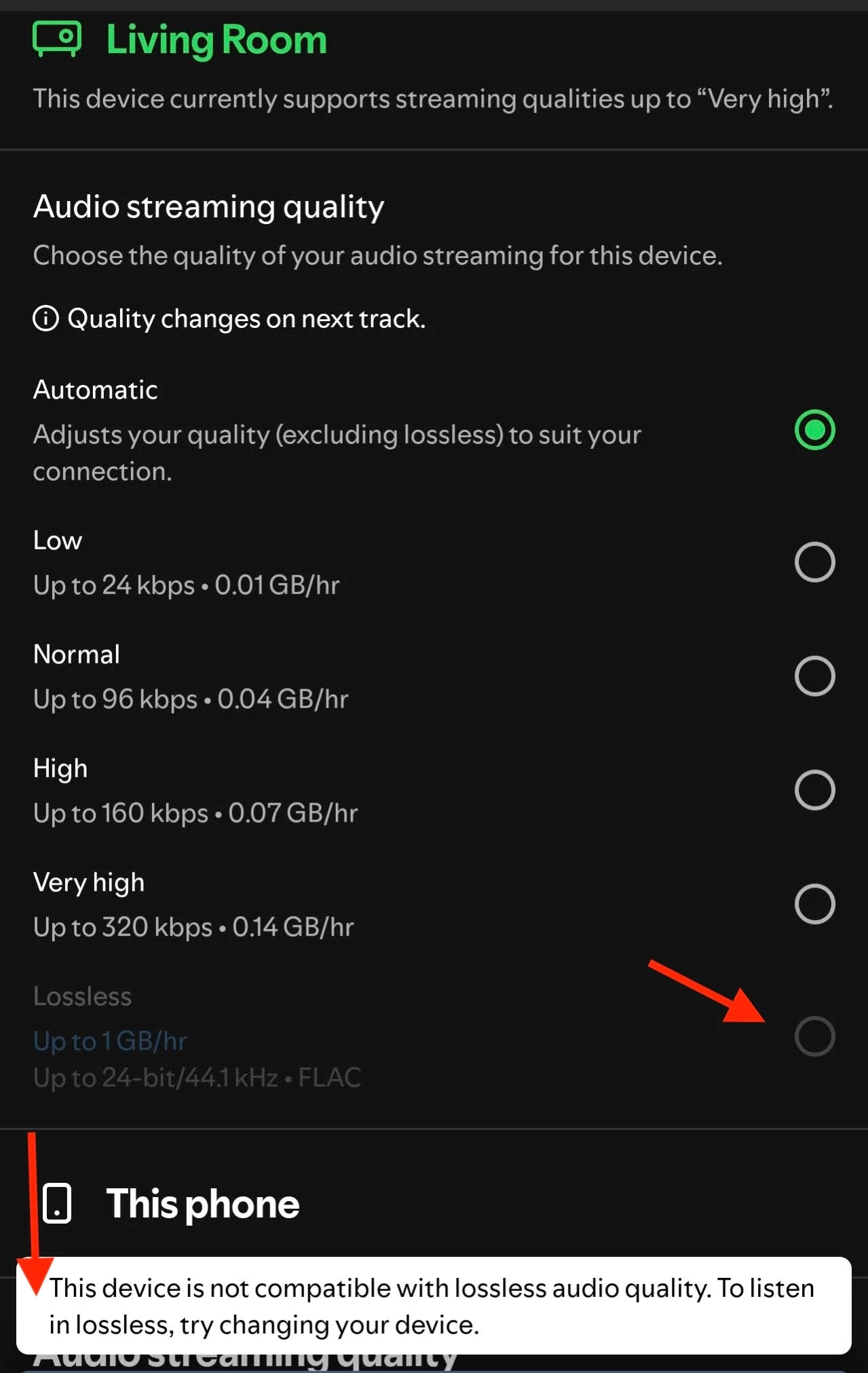 "This device is not compatible with lossless audio quality. To listen in lossless, try changing your device."