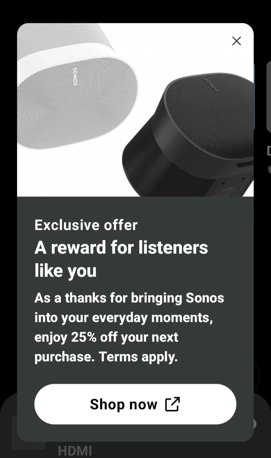 I got this 25% discount offer (illustrated below) in the Sonos app but it never gets applied on the actual site. I got all the way to "place order" but nothing, no sign of any discount anywhere. Is this discount real or just yet another instance in an ever longer line of Sonos "app stuff that doesn't work"? If real then why isn't it being applied in any part of the purchase process?? (Yes I reached the site by clicking in-app & yes I am logged in.)