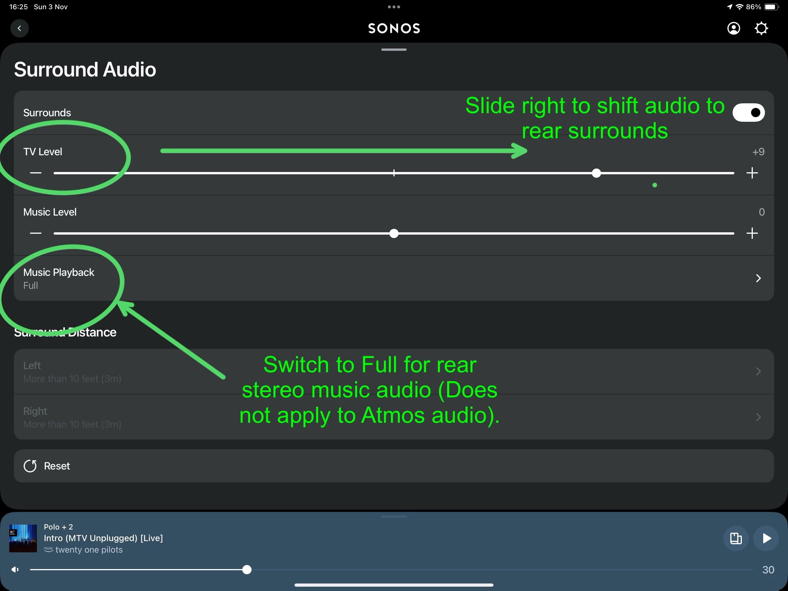 For music audio, simply swap the ‘Ambient’ option to ‘Full’ for music playback - that’s also highlighted in the attached screenshot. Both feature settings are located in the HT room ‘Surround Audio’ section.