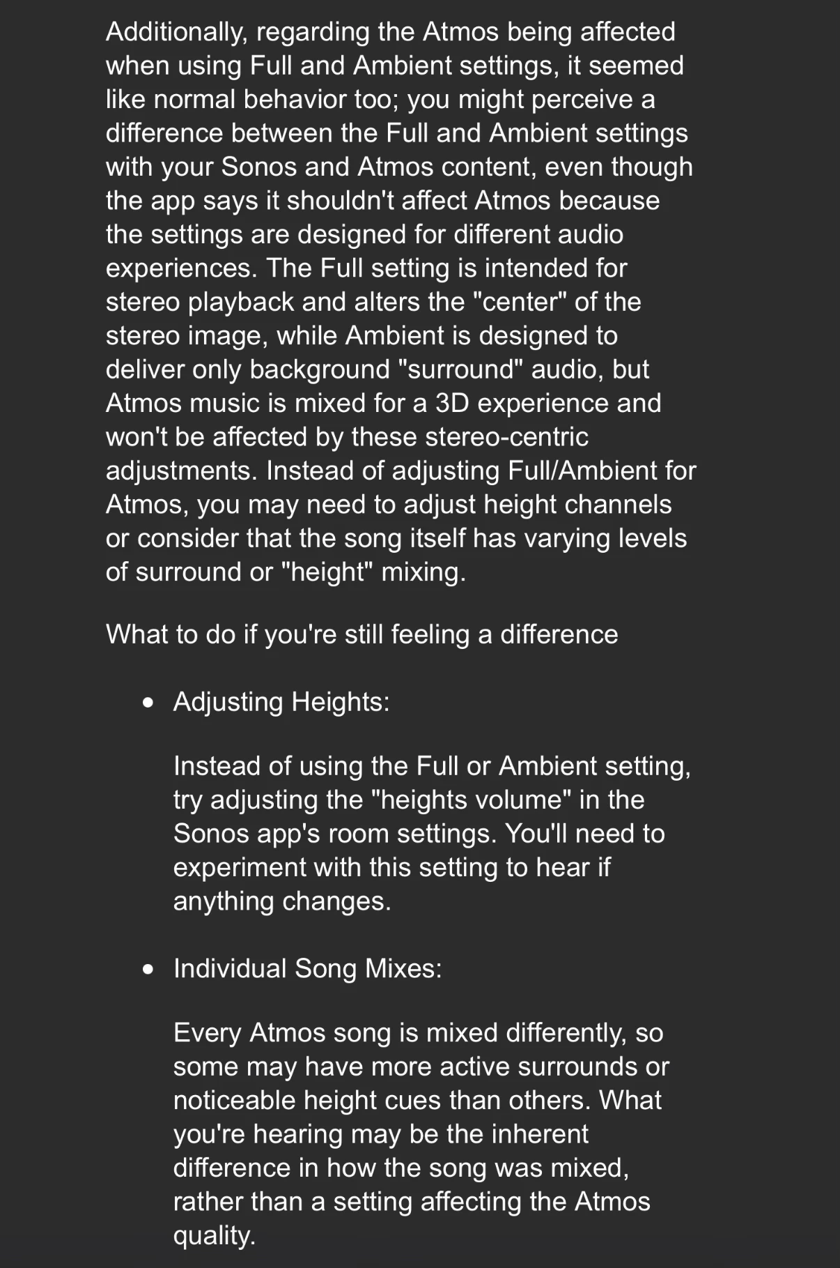 This is an issue I posted about a while ago, but it unfortunately is still happening. When I play Atmos music (from Apple Music, Amazon music, and Tidal — all inside the Sonos app) through my Arc Ultra + Era 300 system, the Ambient/Full music playback settings change the sound of the Era 300s even though that setting says it doesn’t apply to Atmos playback. With Ambient selected, the Era 300s are filtered to play a smaller frequency range, just like the setting does when playing stereo music. I have confirmed 100% that I am playing Atmos music and attempted this with multiple services all within the Sonos app, so I know it is not an issue of playing the wrong format. I’m wondering if others have experienced this as well. Thank you!