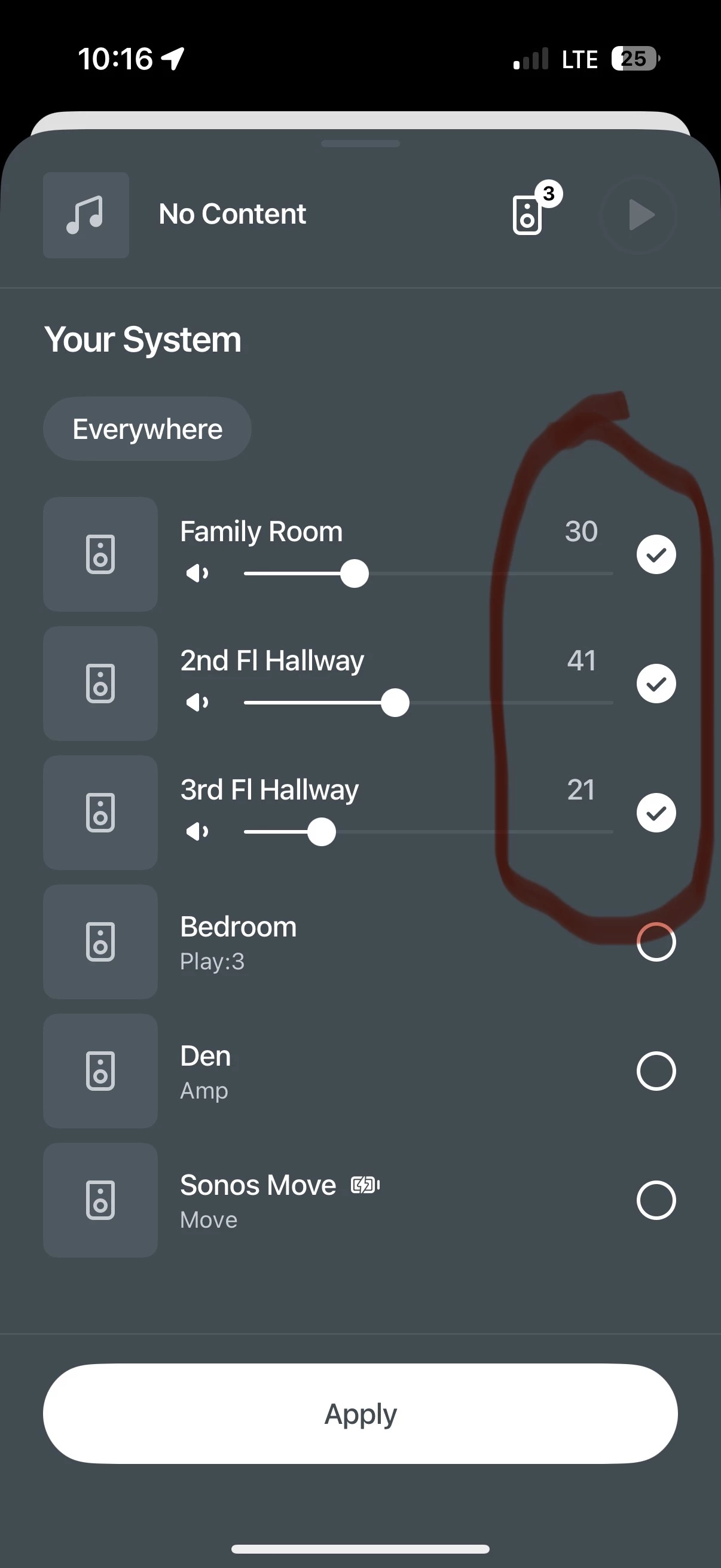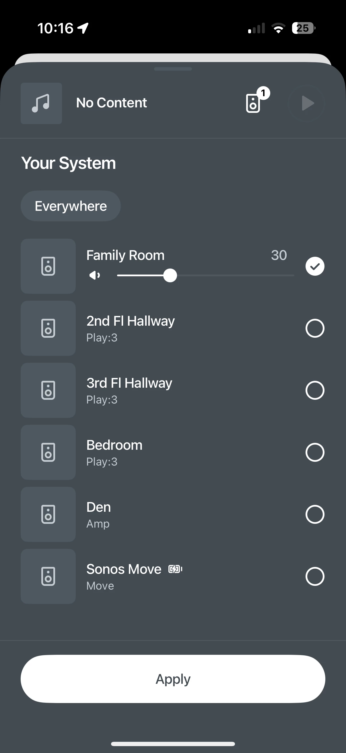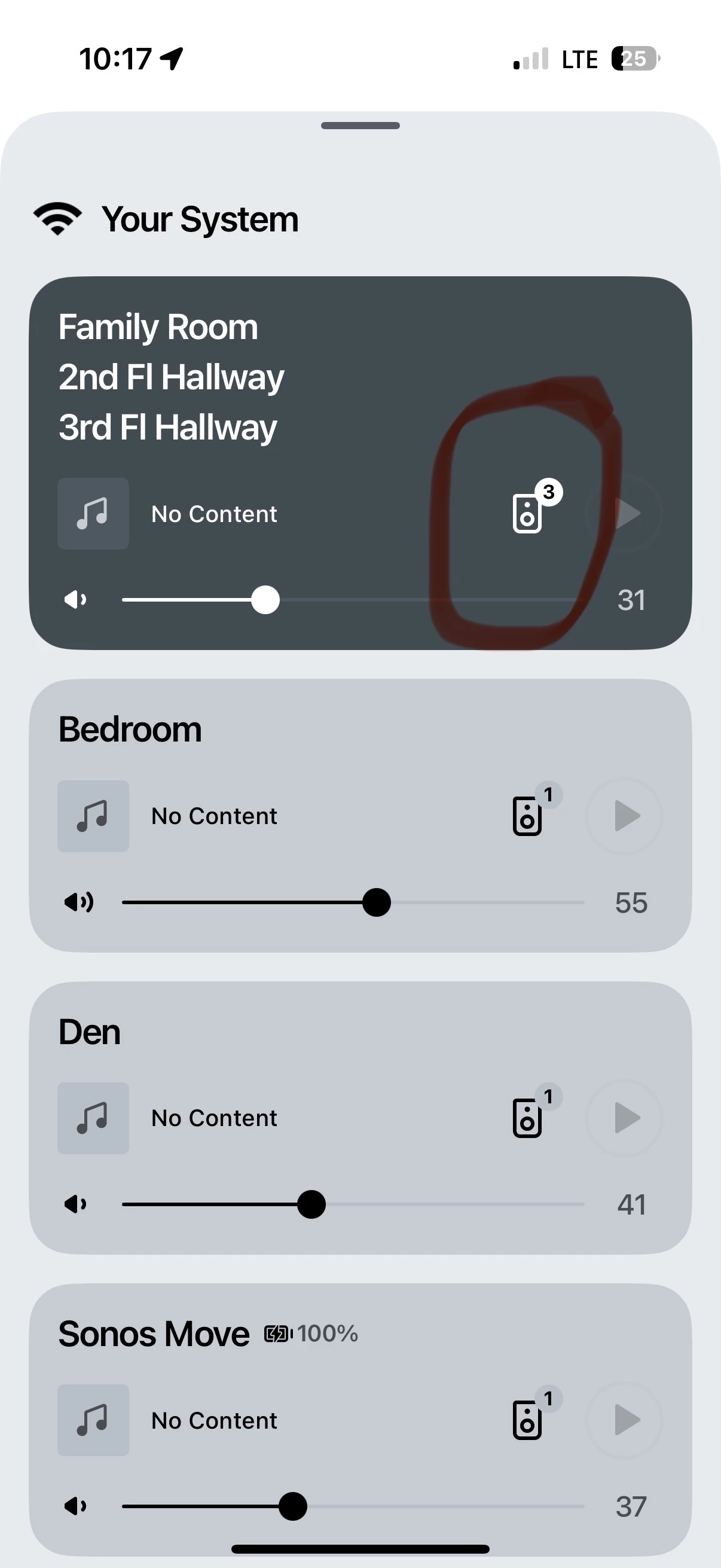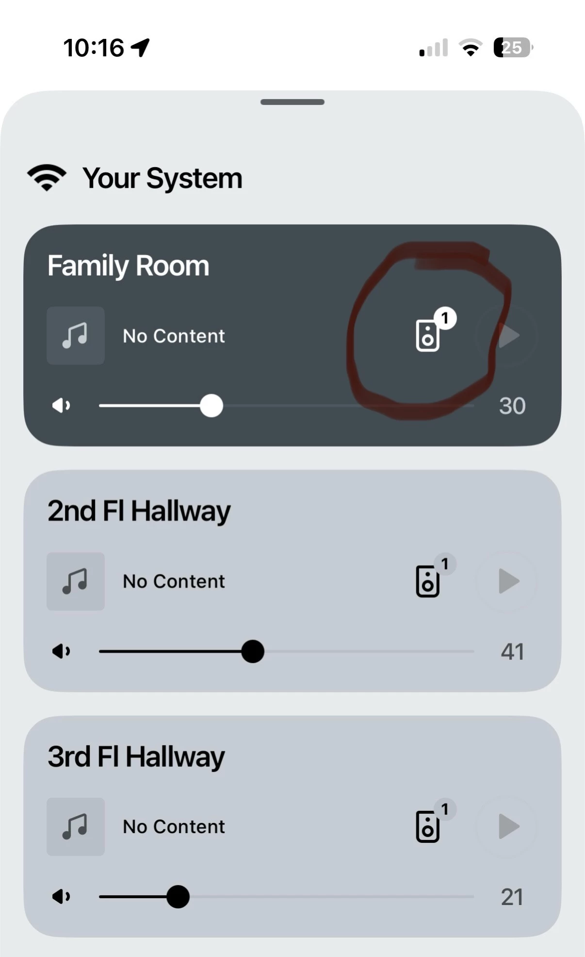 After you set them up as different rooms, you can select either speaker and tap the speaker icon with a “1” on it. This will bring up a page with both speakers. Select the other speaker and tap “Apply” at the bottom of the page.