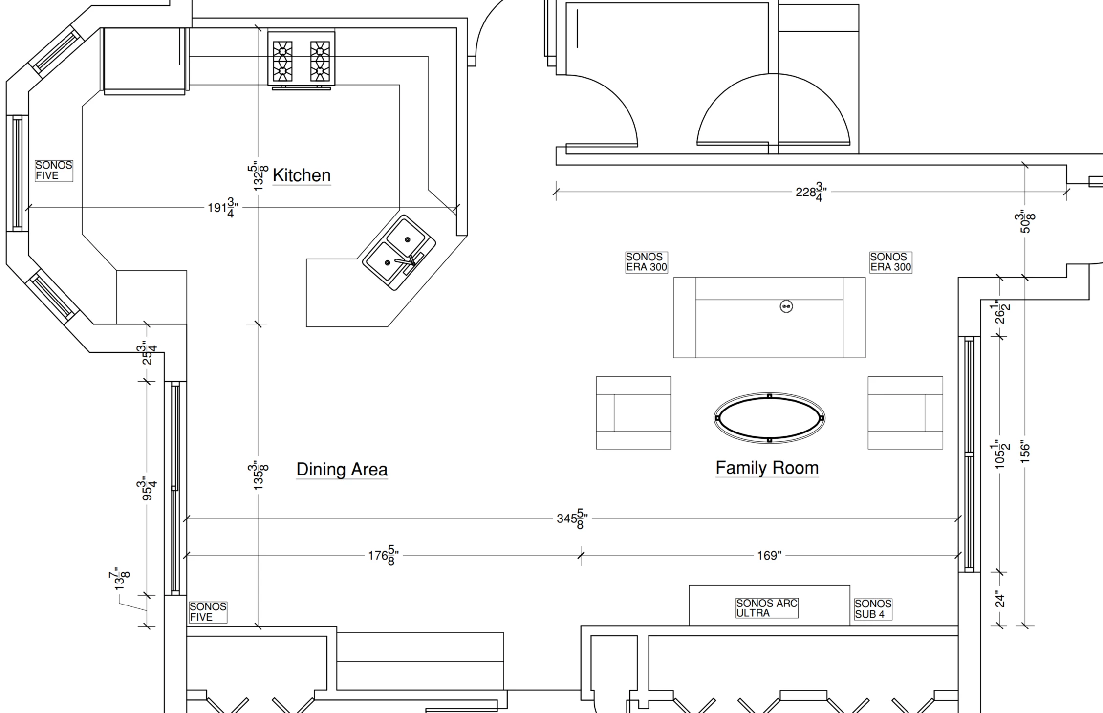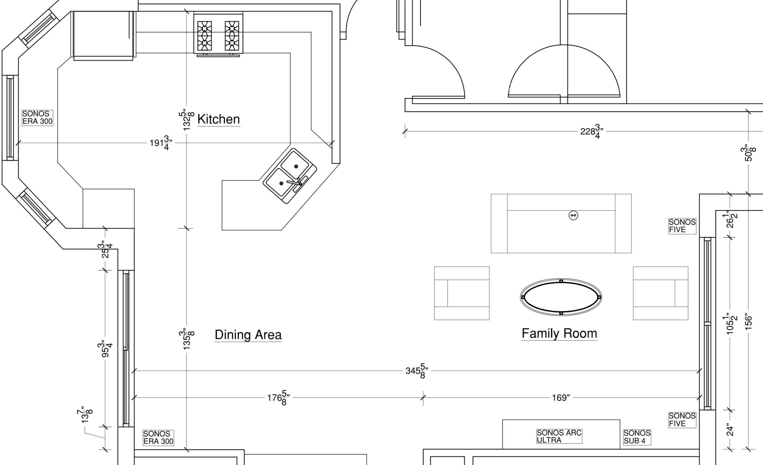 Hello everyone. Quick question about speaker placement as I am fairly new to Sonos. I recently upgraded to the arc ultra, gen 4 sub, 1 pair of Fives and 1 pair of Era 300 from 1 pair of one SL and 1 pair of Era 100. Below is the open concept floor plan. I plan on using the arc and sub for home theater and the Fives and Era 300 for playing music. The arc would go below the TV on the unit and the sub to the left of it. My plan was to put the 1 pair of Fives on speaker stands in the family room. Put the one Era 300 in the dining room on a stand and the one Era 300 in the dining room directly on the counter as it is out of the work area. Any suggestions would be greatly appreciated.