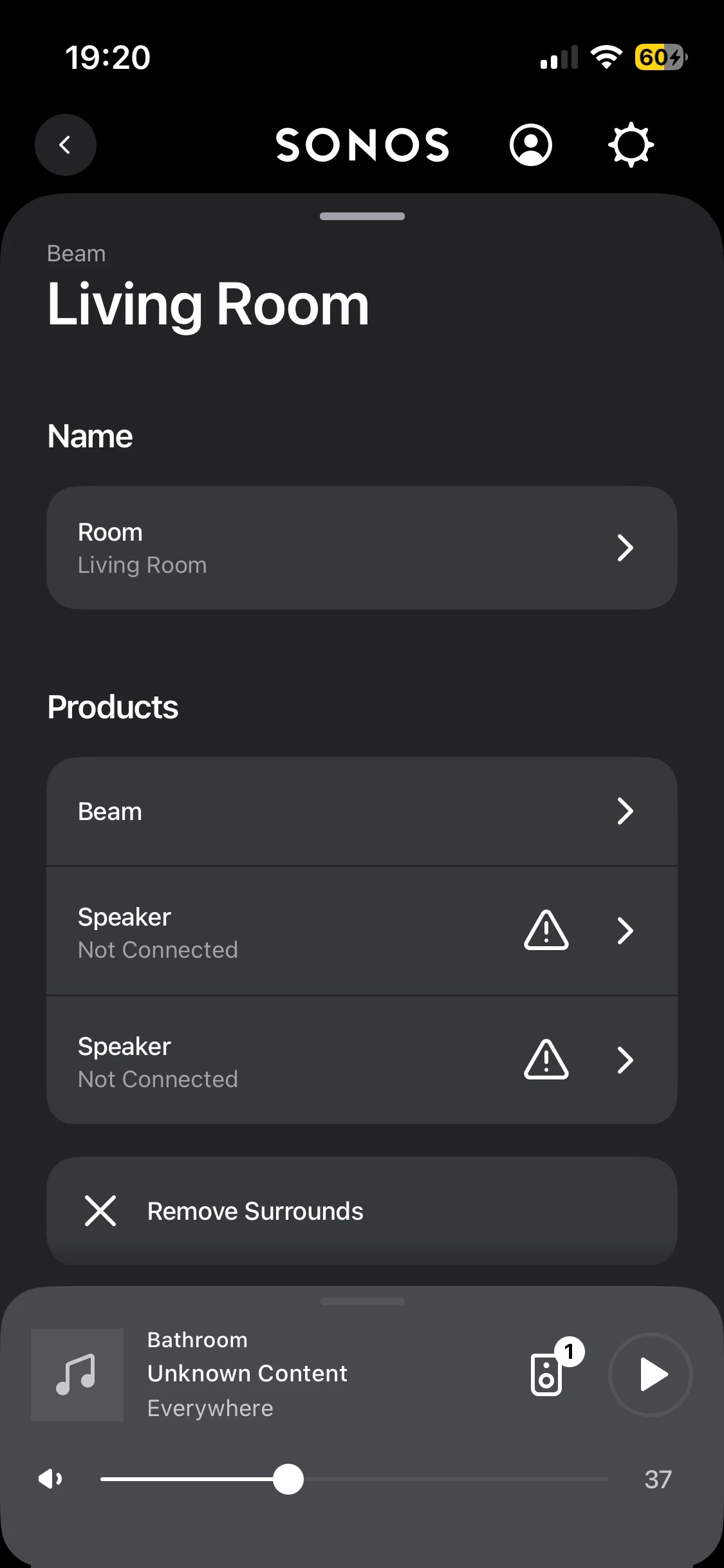 Huh. That’s odd. I’d disconnect them (such as they are semi-connected) as surrounds, so they show up as ‘normal’ speakers again. Then I’d double check to ensure the entire system is updated, by checking for updates in the controller. Make sure the radio/wifi on the Beam is not turned off.