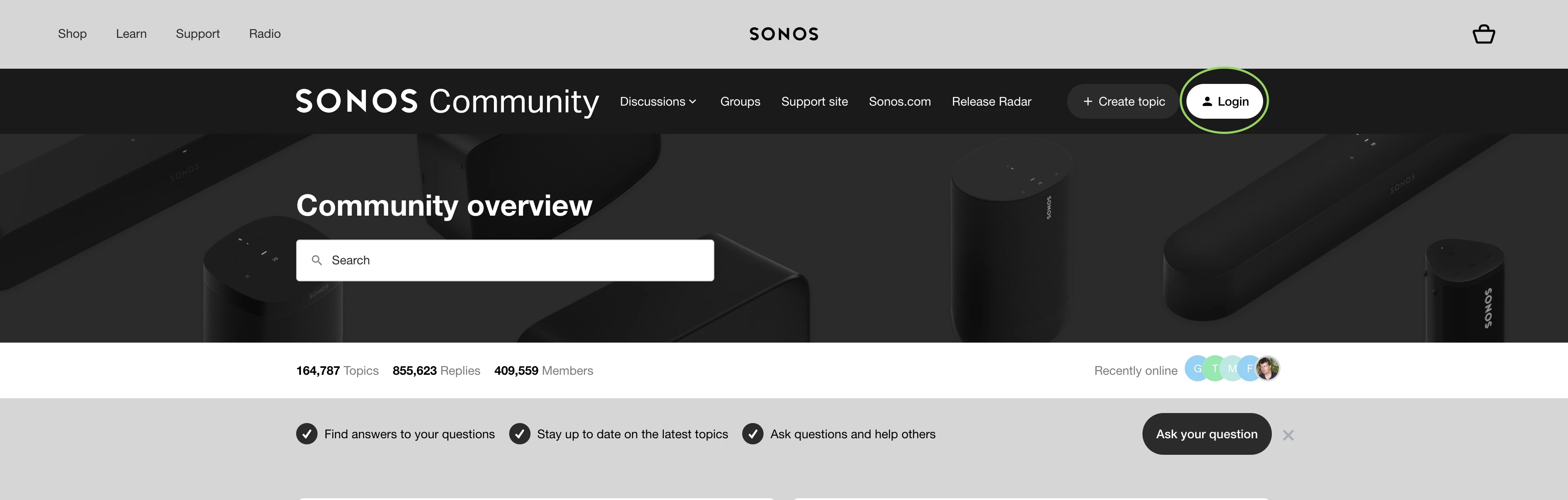 Clicking this will either create a user profile, or log you in to the community page, using the same account details (Email and password) that you also use on Sonos.com to manage your orders and devices etc.