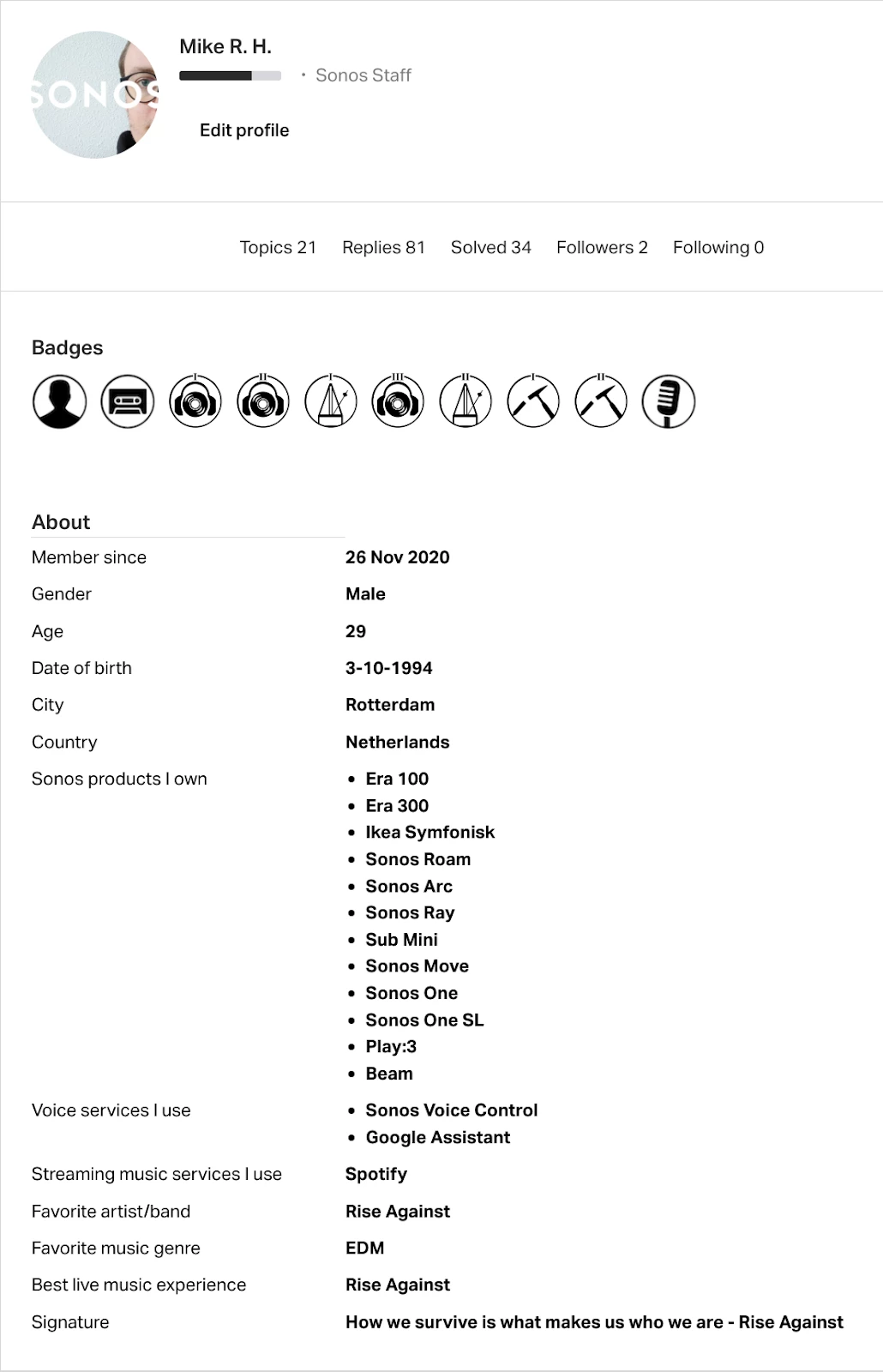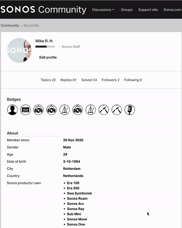 On the first page, you will see an overview of your public facing profile. This is where you can change your profile picture, add, or remove the speakers you own and other kind of information you want to the community to see.