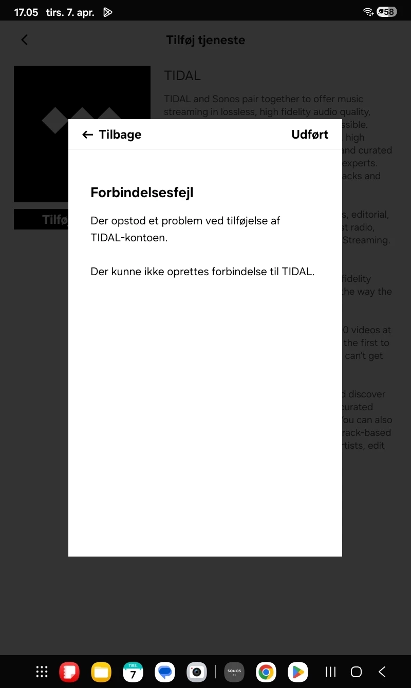 I have re-installed Sonos S1 on my Samsung tablet and now I can't connect to Tidal. See the image below. How do I solve the problem?