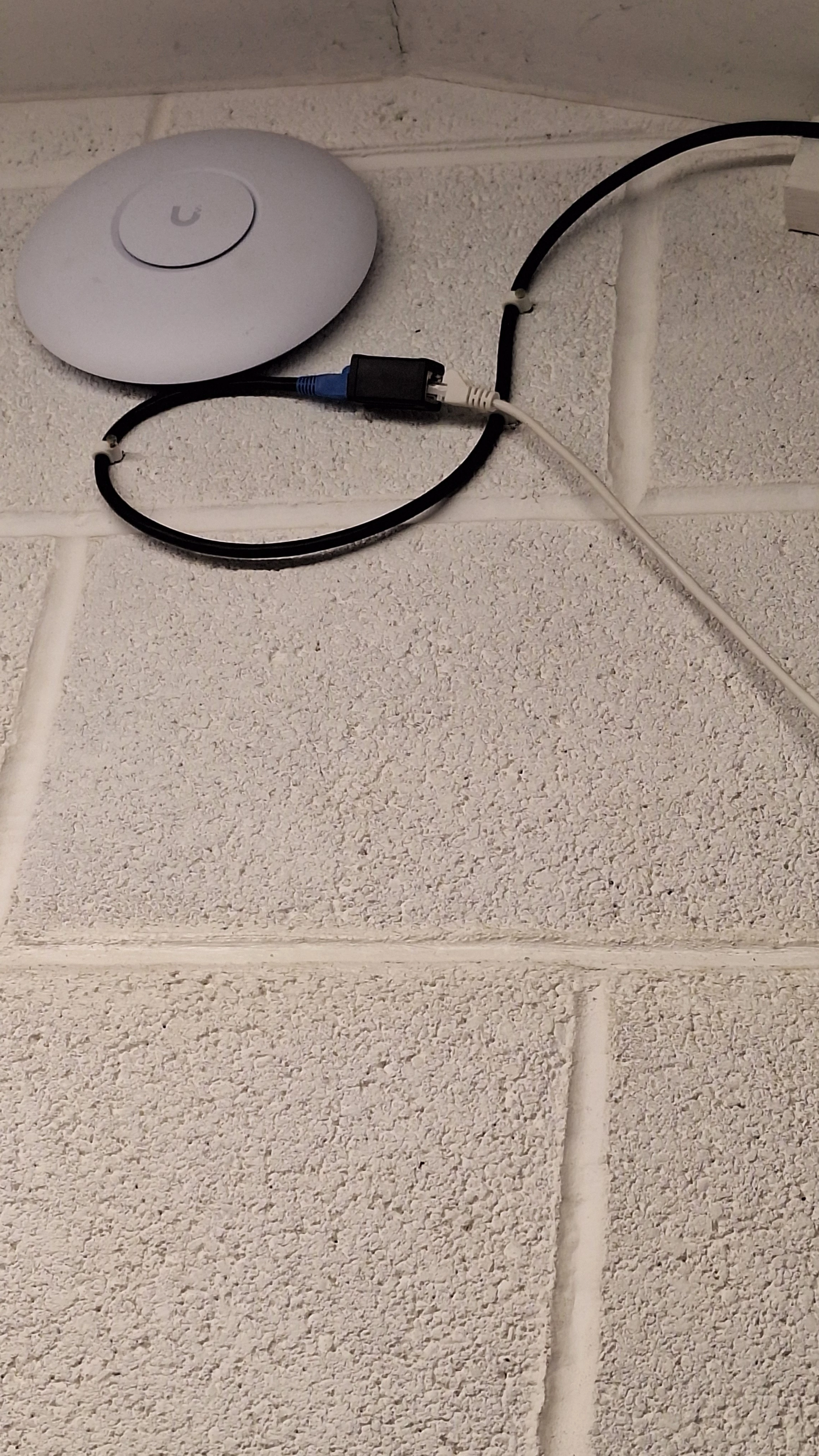 He has run a cat cable from the router down to the garage underground into the workshop. And it is connected to a new WiFi extender type thing that emits its own WiFi signal.
