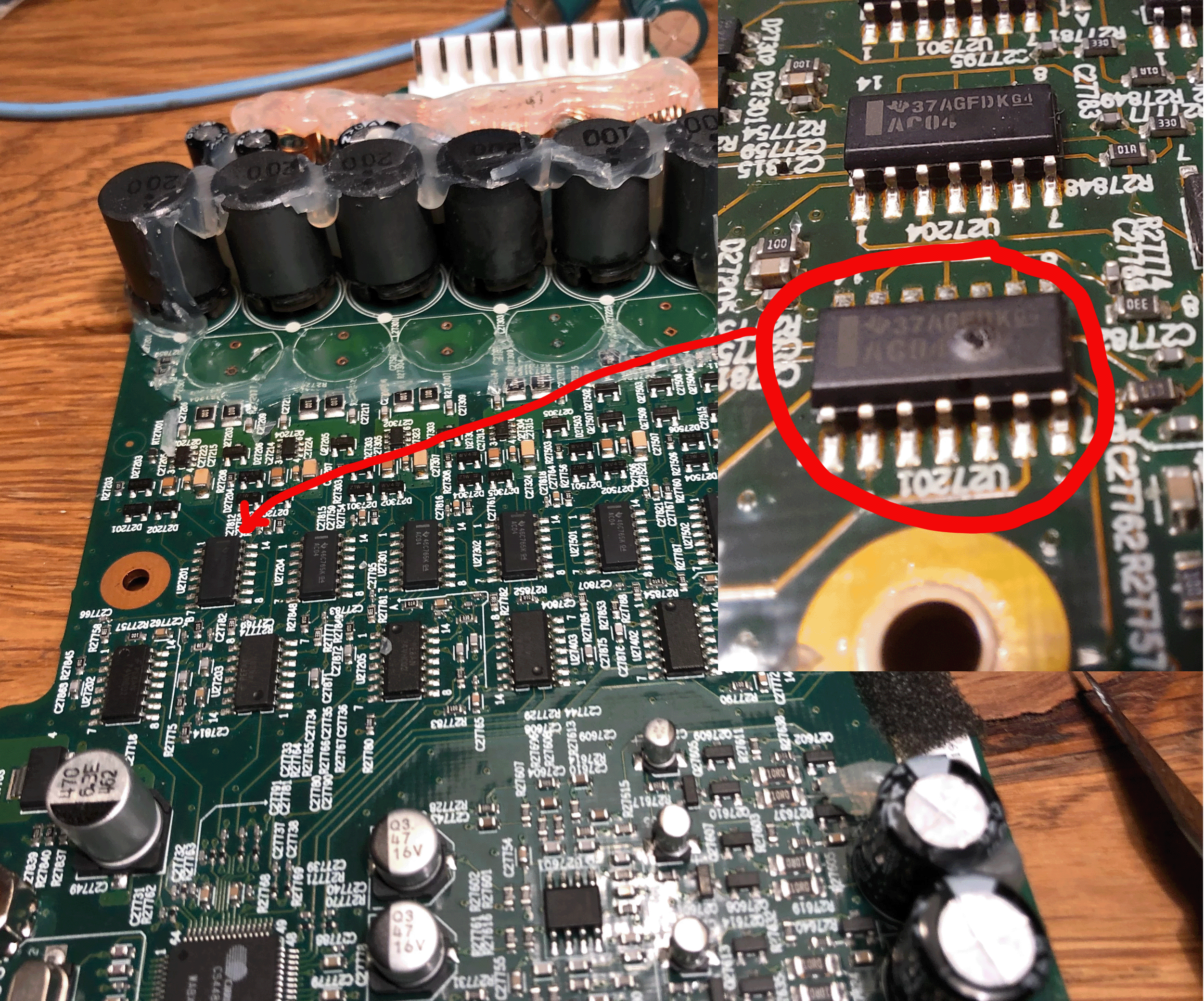 Play 5 works fine on app, and i can get sound over headphones, but no sound true speakers. I replace some bad cups but still no sound. Then i notice one of the IC has a hole in it, Does any one know what will be the replace part markings. I have marked on pictures, there is a five of them and they are all the same type of IC. Thank you