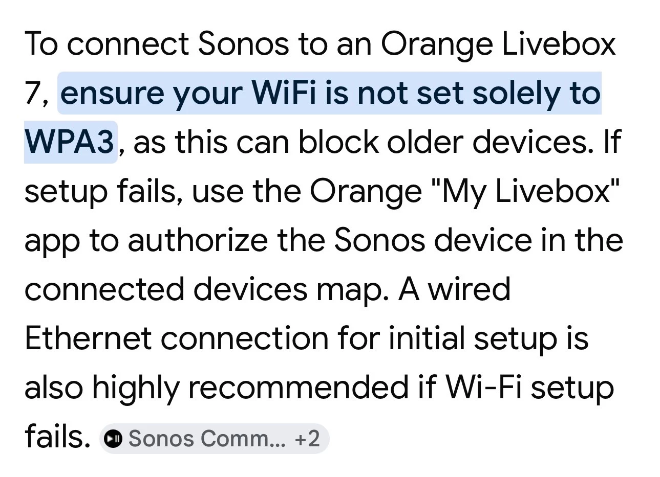 I just got a new router from Orange; a Livebox7. I have configured a 2.4GHz band. But failed to connect 3 One SL speakers. I can see the speakers in my router connected to the WiFi, but the Sonos app does not see the speakers and I Conan not finalize the set up. Sonos customer care was not able to help, after endless resets, etc. Is there someone who can explain how to change the settings on my router to make this work?