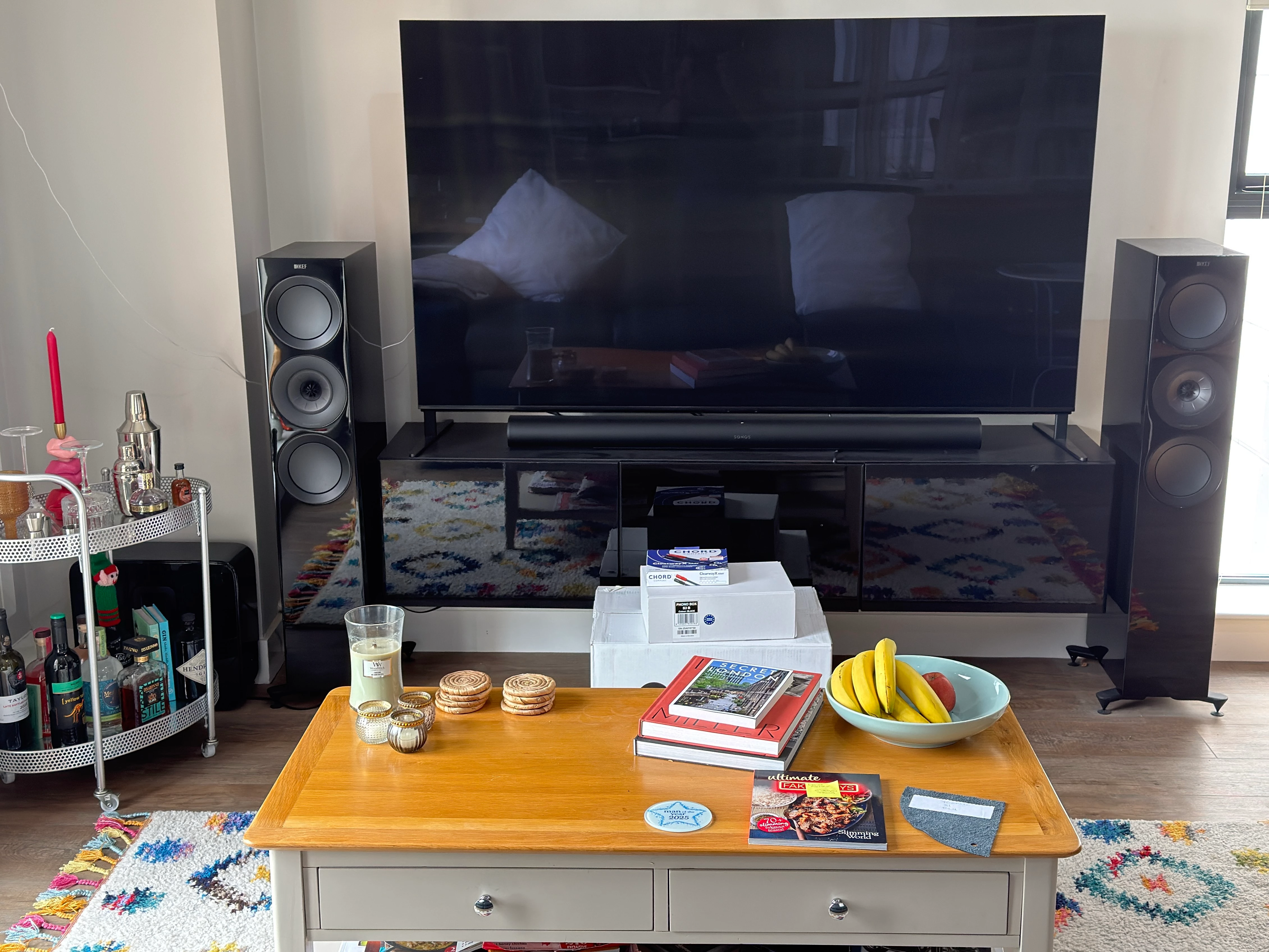 TV and Arc in process of being wall mounted, desk size reduced and Sofa moving back about 1/2M