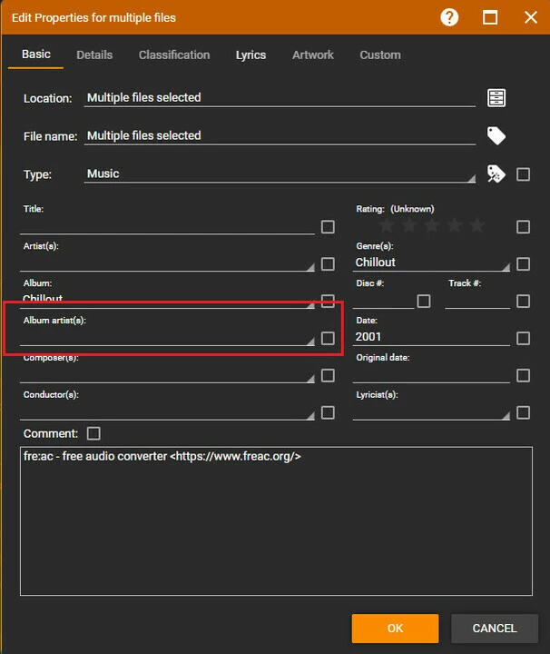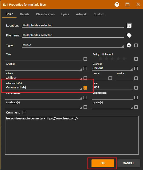 To change this, we want to enter “Various Artists” into the Album Artist tag (this will make the check mark next to it get filled in, meaning an action will be taken, then click on OK: