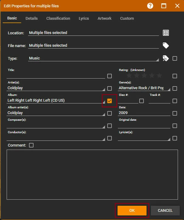 To force the tracks to all have the same entry, all you need to do is click the checkbox next to Album Title, then click on OK: