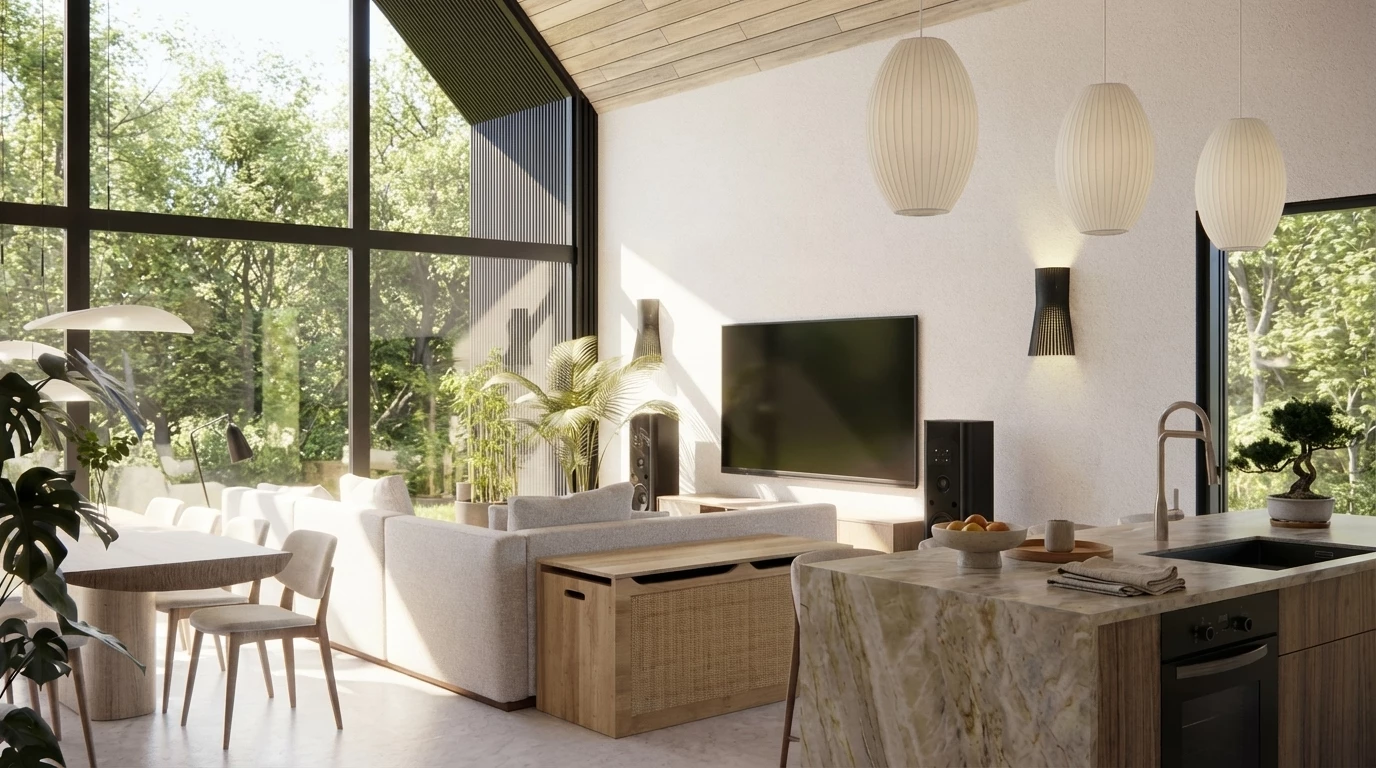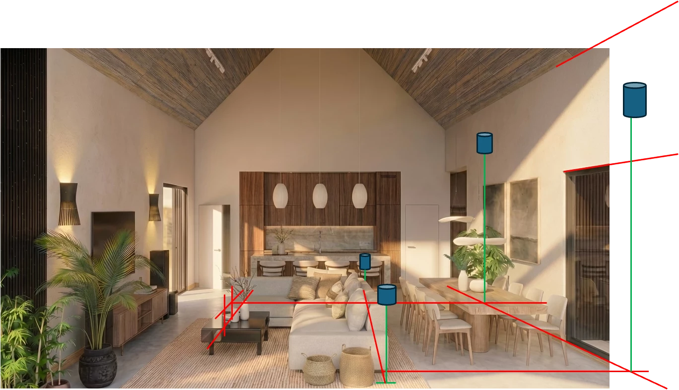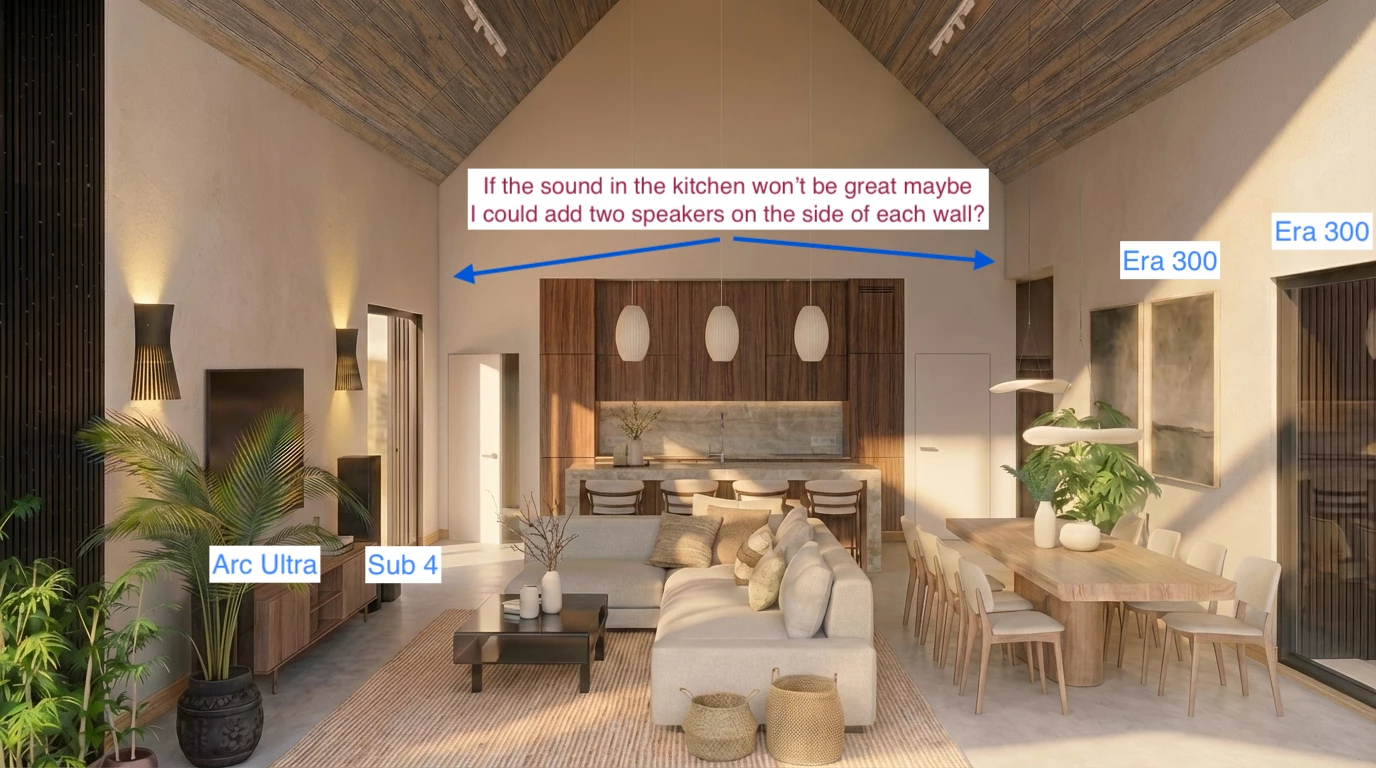 I’m currently planning out a Sonos system for my new living area and would love some expert eyes on the layout. It's a very open, airy space with a vaulted ceiling and a massive floor-to-ceiling window wall on one side, which I know can be a nightmare for acoustics.